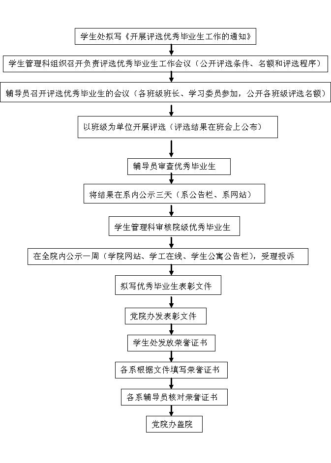 学生处拟写《开展评选优秀毕业生工作的通知》→学生管理科组织召开负责评选优秀毕业生工作会议(公开评选条件、名额和评选程序)→辅导员召开评选优秀毕业生的会议(各班级班长、学习委员参加,公开各班级评选名额)→以班级为单位开展评选(评选结果在班会上公布)→辅导员审查优秀毕业生→将结果在系内公示三天(系公告栏、系网站)→学生管理科审核院级优秀毕业生→在全院内公示一周(学院网站、学工在线、学生公寓公告栏),受理投诉→拟写优秀毕业生表彰文件→党院办发表彰文件→学生处发放荣誉证书→各系根据文件填写荣誉证书→各系辅导员核对荣誉证书→党院办盖院