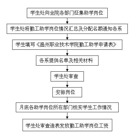 学生处向全院各部门征集助学岗位→学生处将勤工助学岗位情况汇总及分配名额通知各系→学生填写《温州职业技术学院勤工助学申请表》→各系提供名单及相关材料→学生处审查→安排岗位→月底各助学岗位所在部门核实学生工作情况→学生处审查造表发放勤工助学岗位工资