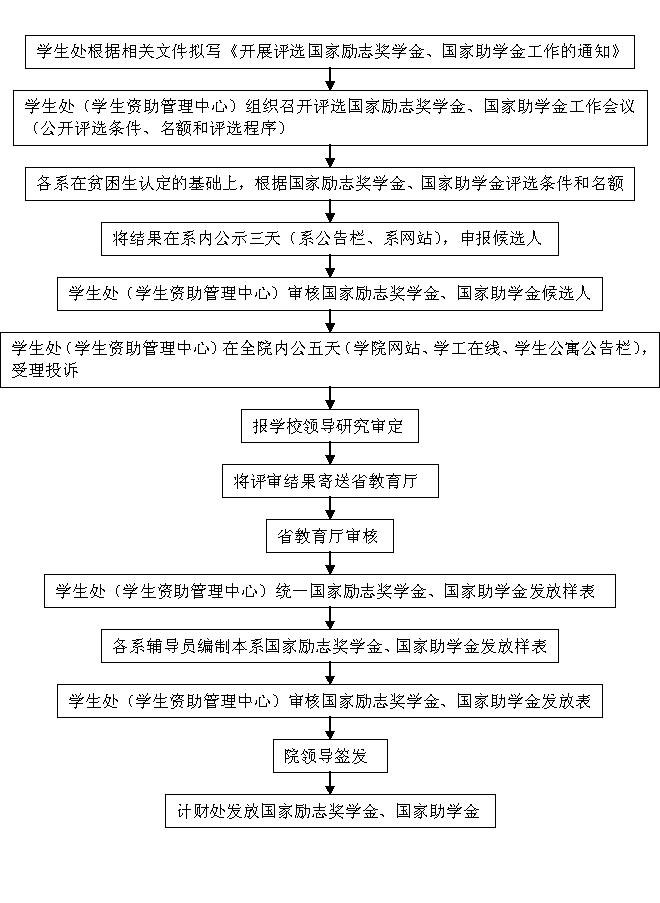 学生处根据相关文件拟写《开展评选国家励志奖学金、国家助学金工作的通知》→学生处(学生资助管理中心)组织召开评选国家励志奖学金、国家助学金工作会议(公开评选条件、名额和评选程序)→各系在贫困生认定的基础上,根据国家励志奖学金、国家助学金评选条件和名额→将结果在系内公示三天(系公告栏、系网站),申报候选人→学生处(学生资助管理中心)审核国家励志奖学金、国家助学金候选人→学生处(学生资助管理中心)在全院内公五天(学院网站、学工在线、学生公寓公告栏),受理投诉→报学校领导研究审定→将评审结果寄送省教育厅→省教育厅审核→学生处(学生资助管理中心)统一国家励志奖学金、国家助学金发放样表→各系辅导员编制本系国家励志奖学金、国家助学金发放样表→学生处(学生资助管理中心)审核国家励志奖学金、国家助学金发放表→院领导签发→计财处发放国家励志奖学金、国家助学金