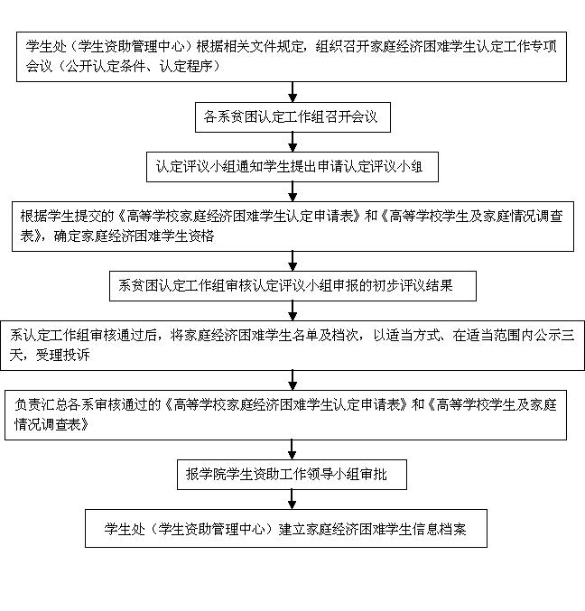 学生处(学生资助管理中心)根据相关文件规定,组织召开家庭经济困难学生认定工作会议(公开认定条件、认定程序)→各系贫困认定工作组召开会议→认定评议小组通知学生提出申请认定评议小组→根据学生提交的《高等学校家庭经济困难学生认定申请表》和《高等学校学生及家庭情况调查表》,确定家庭经济困难学生资格→系贫困认定工作组审核认定评议小组申报的初步评议结果→系认定工作组审核通过后,将家庭经济困难学生名单及档次,以适当方式、在适当范围内公示三天,受理投诉→负责汇总各系审核通过的《高等学校家庭经济困难学生认定申请表》和《高等学校学生及家庭情况调查表》→报学院学生资助工作领导小组审批→学生处(学生资助管理中心)建立家庭经济困难学生信息档案