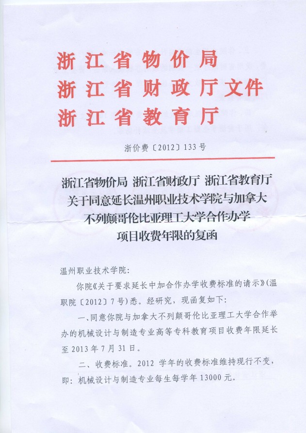 • 关于同意延长温州职业技术学院与加拿大不列颠哥伦比亚理工大学合作办学项目收费年限的复函
