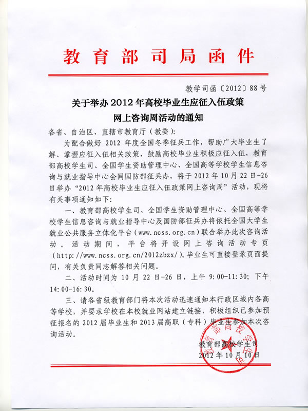 • 关于举办2012年高校毕业生应征入伍政策网上咨询周活动的通知