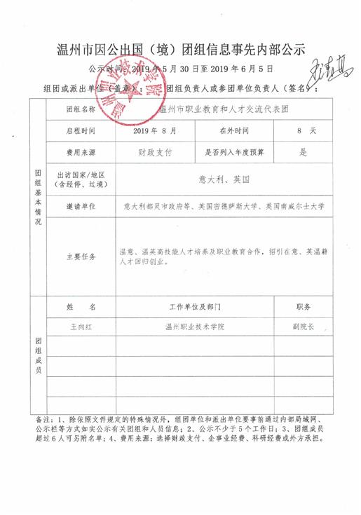 • 温州市因公出国(境)团组信息事先内部公示(王向红)