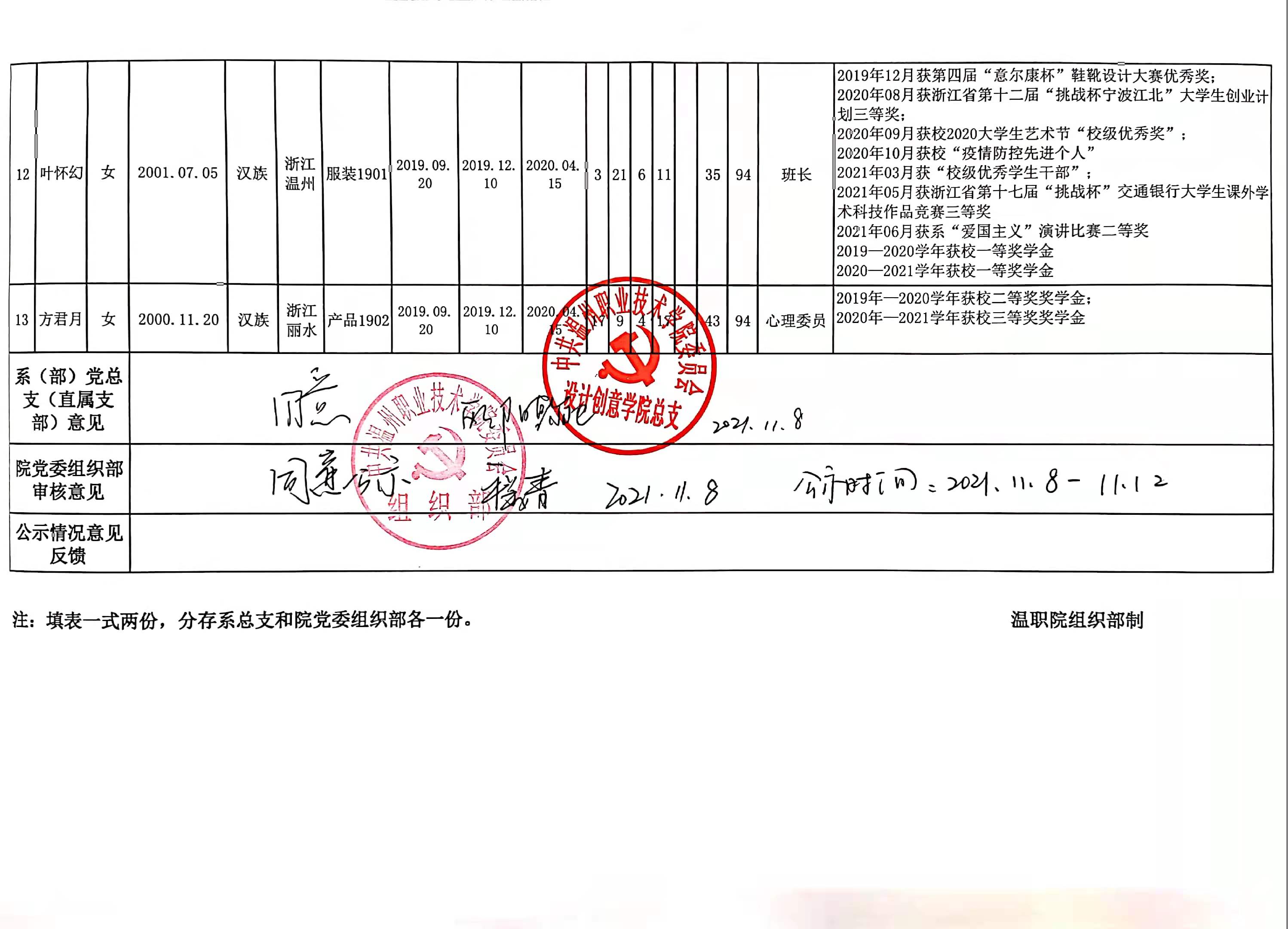 •         根据本人申请、组织培养、经设计创意学院党总支审核、院组织部预审,拟吸收潘乐乐等13名同志为中共预备党员,现将他们的有关情况予以公示。