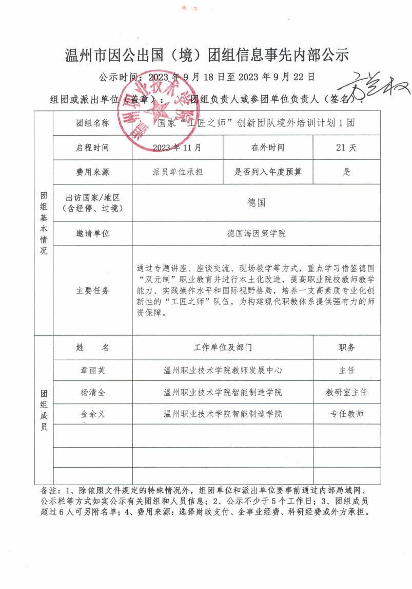 • 关于章丽芙、杨清全和金余义因公赴德国的事先内部公示