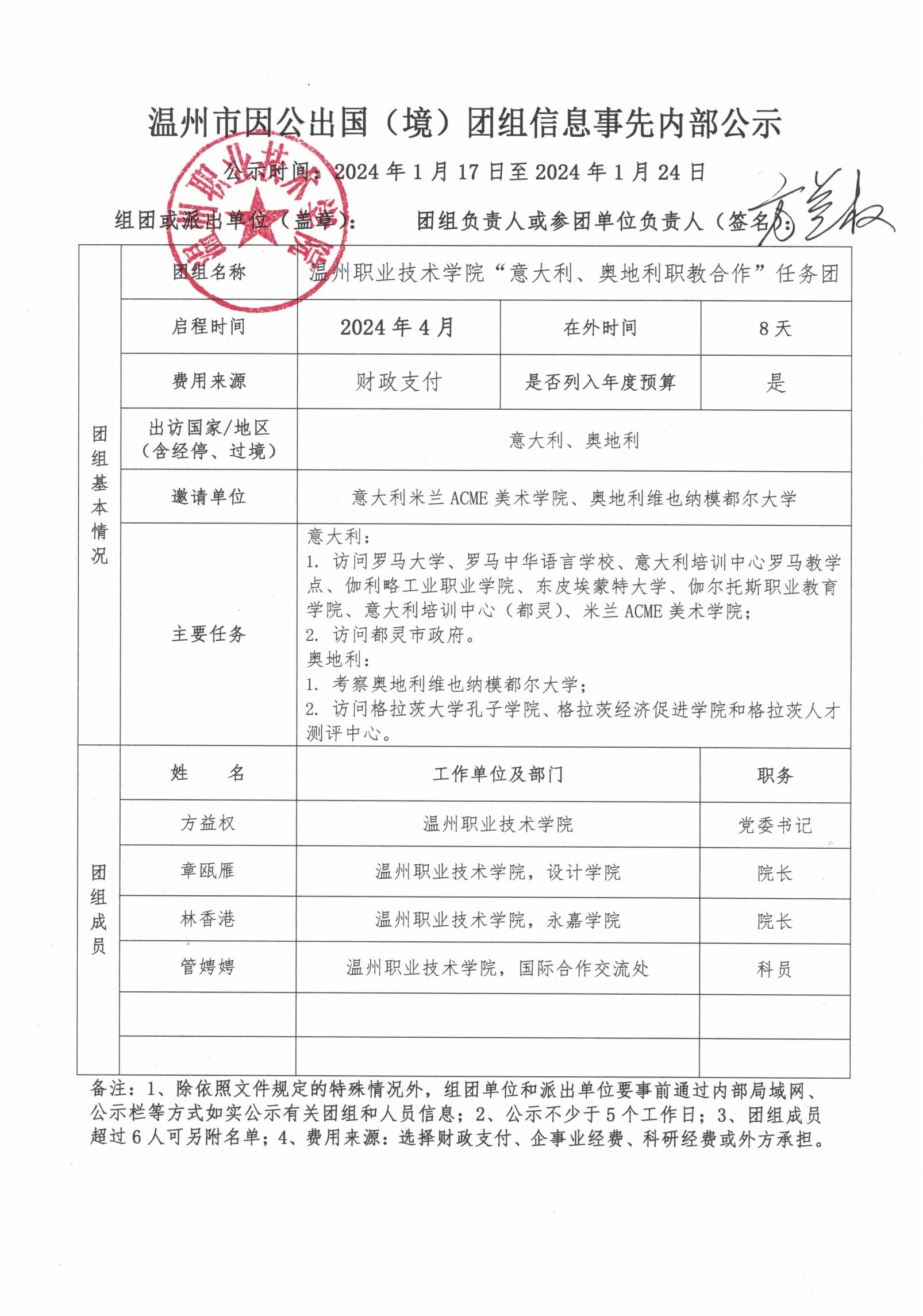 • 关于方益权等4人因公赴意大利、奥地利的事先内部公示